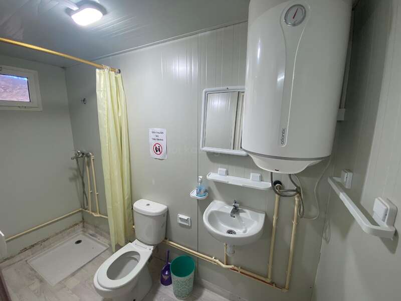 we live in portocabins that are heated by airconditioners, every cabin has its own bathroom with a shower, toilet and sink, and the kitchen is separate in a different cabin, we cook on gas, have refrigerators and a freezer, also a little oven is available.