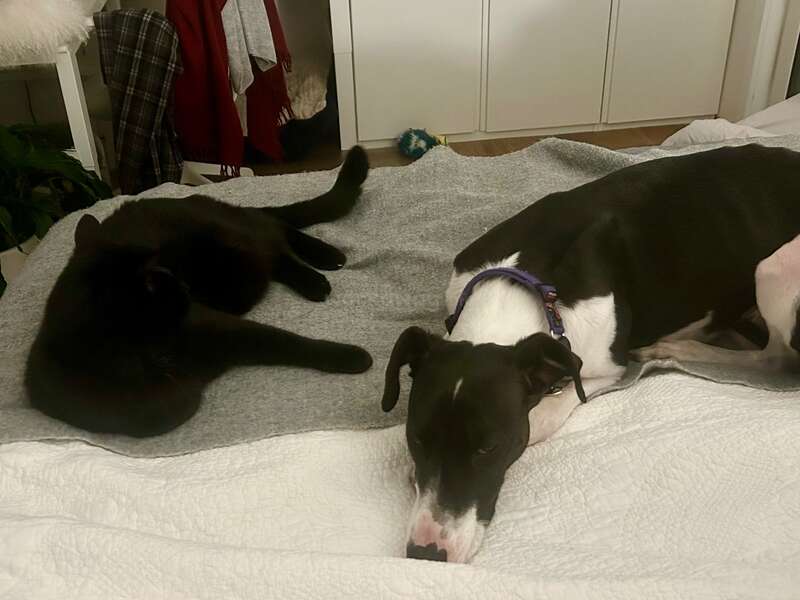 1 cheeky black cat, My Buckley & a sweet little tortoiseshell girl Miss Jiggly, who is very snuggly and the gorgeous dog, Ernie Yamato, Whippet X. I work from home so they are not used to be left alone.