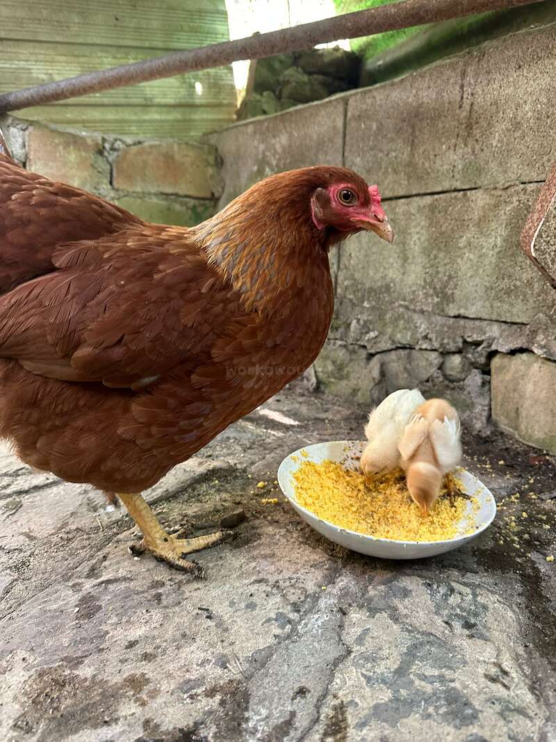 Our work consisted of giving water and food to the animal and cleaning their habitats in the morning. 2 beautiful, curious geese, and 17 chickens.