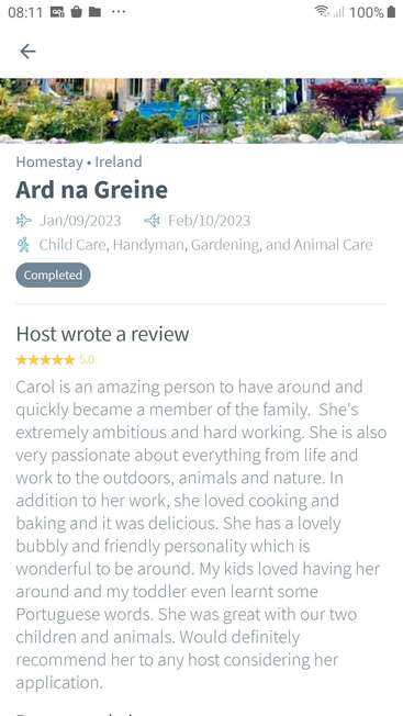 and the third one in Wexford also in Ireland my tasks there was: feed the animals (ferret, dogs , birds) watering the plants , cleaning the kitchen, organizing files , and child care , both volunteering by Worldpackers (I have some good reviews on platform as you can see in my last pictures ).