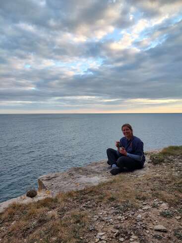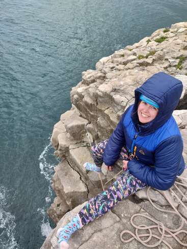 I feel my happiest when I'm surrounded by friends, am out in nature, and it's always a bonus if there is a dog around! My happy place is climbing on sea cliffs in Swanage, on a calm and sunny day with my sister.