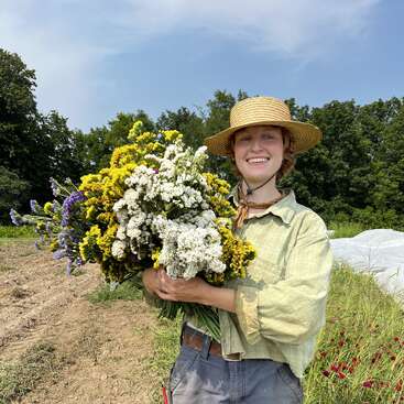 Hi! My name is Bryn, I am a queer artist and farmer living in Burlington, Vermont! I love to engage with my community by contributing to agriculture and advocating for food sovereignty and reciprocal relationships to our food and eachother. Being an artist is a core part of my identity, and I always make space for a creative practice in my life, whether that is alone or in collaboration with others. I'm fond of hosting art-making potlucks to create sweet togetherness around making and eating, and surround myself with people who inspire me. I also love to cook, read, play guitar, spend time outside, and dance! Working with the land and being active day-to-day is essential for my wellness, and I love to always be learning new skills and challenging myself.