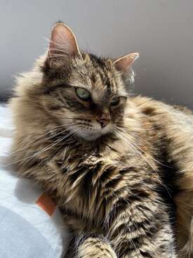 Because she has long fur, Lila benefits from brushing now and then. She prefers being brushed on her head, but with a bit of play she’ll allow more. She also has a sensitive stomach and occasionally vomits, so I’d appreciate photos if it happens. They both eat food for sensitive digestion to help with this.