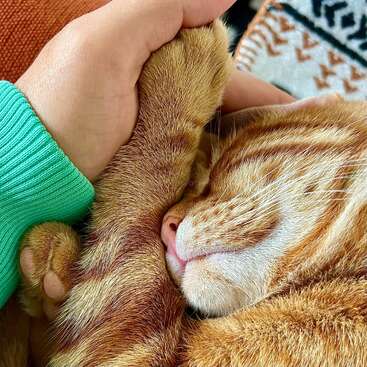 Mr. Timon is a ginger cat who thinks he is a dog. He loves cuddles while sleeping, doesn't usually come to one's lap, but when he does, I love it... No scratching whatsoever, but he thinks that humans are big cats, so he tries to play while biting, so you need to be cautious of your feet.