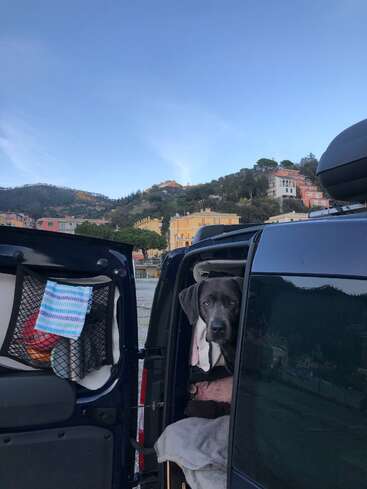 Now I have to confess that I‘m not traveling alone (except when I am flying somewhere), my dog Emmy is with me and always keeps an eye on me. The 8 months with her in our home, the Dacia Dokker, were absolutely amazing and gifted us with a deep bond. She is 9 years old, calm, friendly and very patiently. If you got a ball or water around there is nothing else in her world. Also she is fine with everything to do, LOVES to cuddle and likes animals like cows or sheep. She always protects me, if somebody strange enters the property or house she might bark, but she never bitten anyone or will.